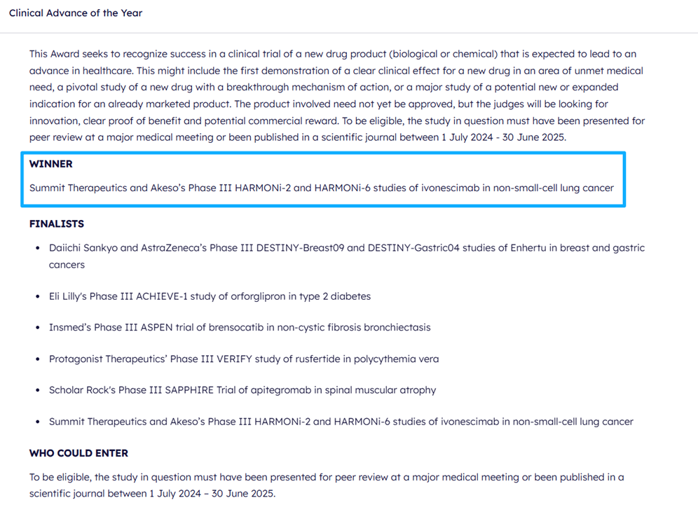 Scrip Awards本届“年度最佳临床进展” 大奖全球共有6款药物重磅研究入围,最终依沃西两项III期研究脱颖而出拿下大奖。全球入围该奖项的药物临床研究包括: